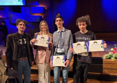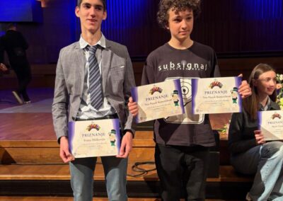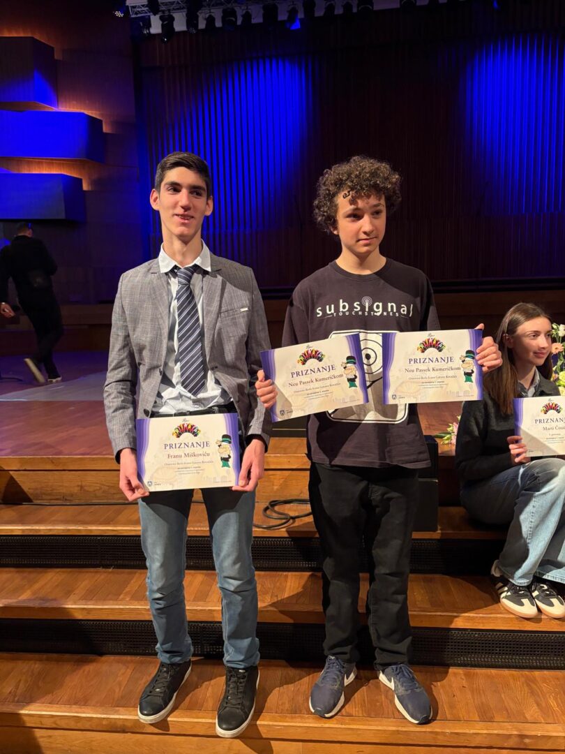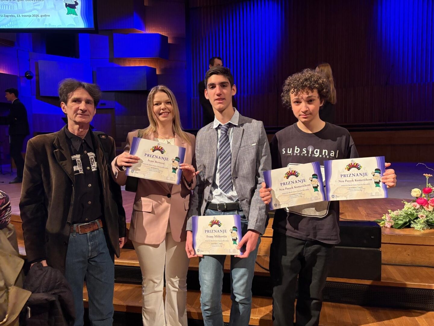 U Koncertnoj dvorani Vatroslava Lisinskog dodijeljene su nagrade „Professor Balthazar“ učenicima i mentorima zagrebačkih osnovnih i srednjih škola koji su na državnim natjecanjima osvojili jedno od prva tri mjesta. Među nagrađenima su i naši učenici Frano Mišković, Neo Passek-Kumerički i Luka Milošević, kao i njihovi mentori Ivana Bertović i Željko Buranji, za uspjehe ostvarene u školskoj godini 2024./2025. Priznanja su uručili gradonačelnik Grada Zagreba Tomislav Tomašević i pročelnik Gradskog ureda za obrazovanje, sport i mlade Luka Juroš.