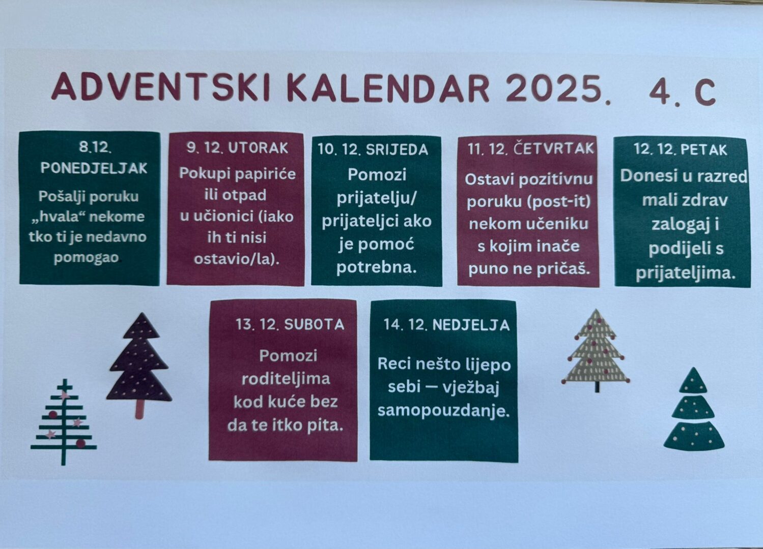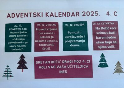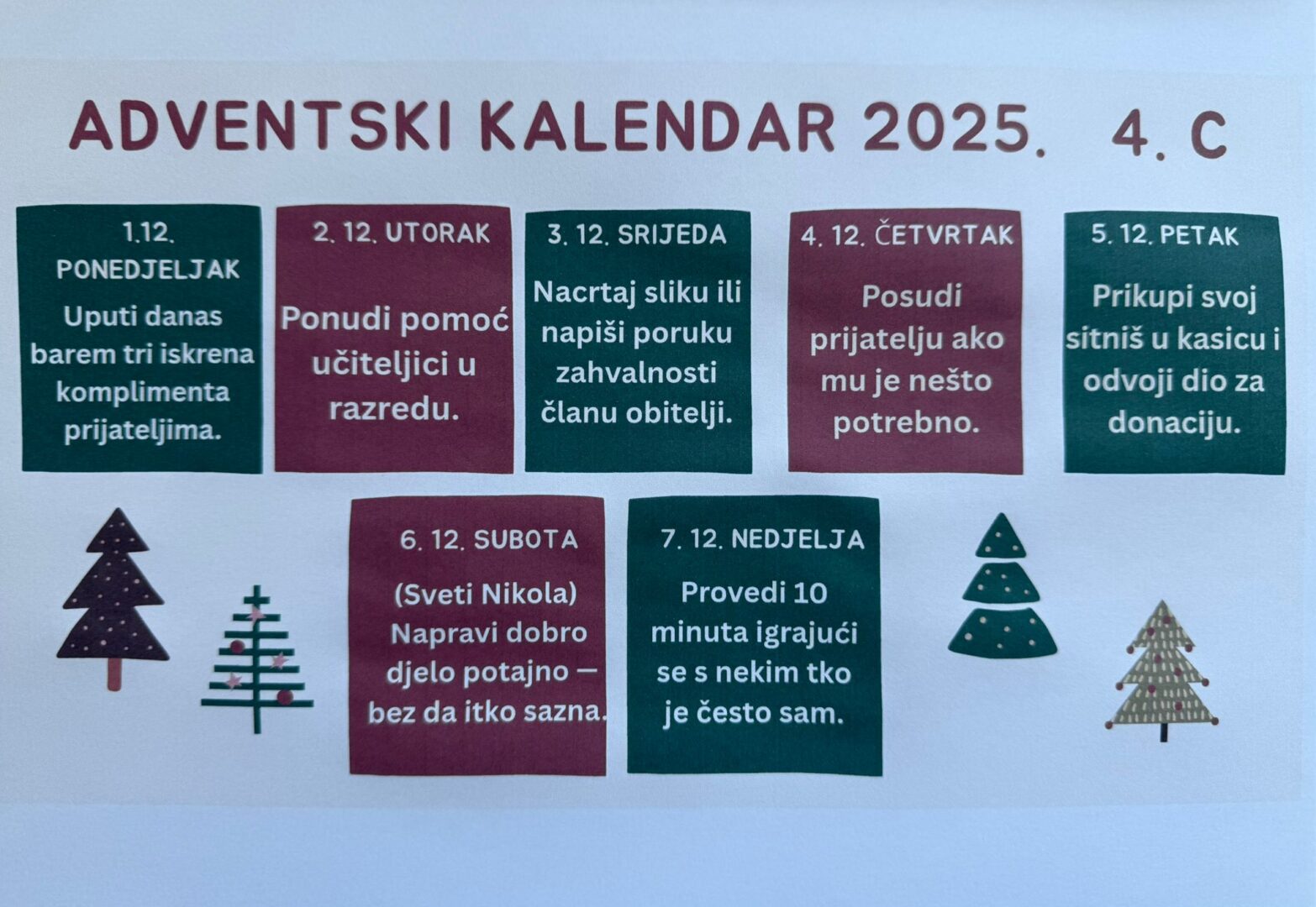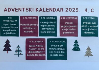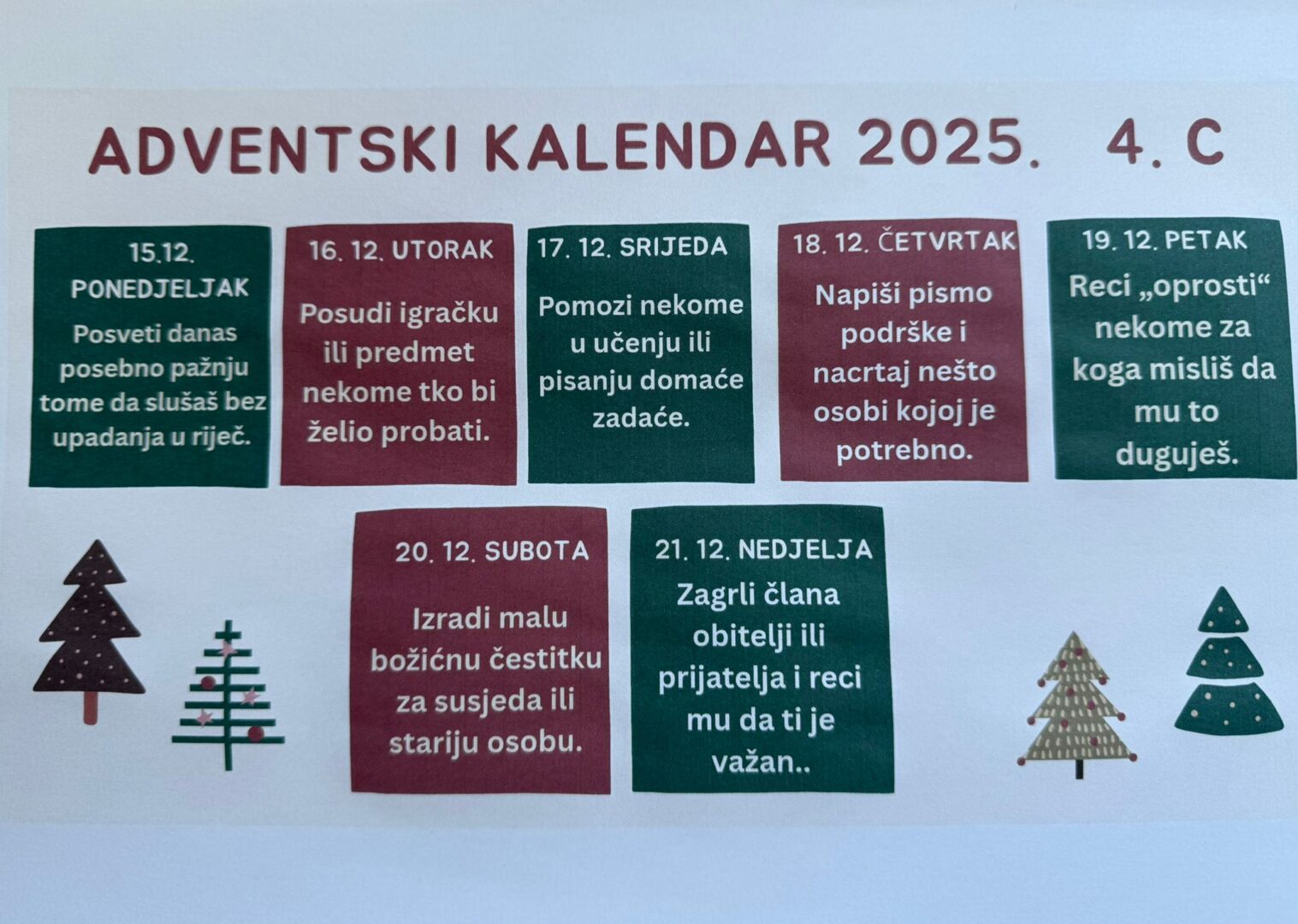 Tijekom mjeseca prosinca učenici 4. c razreda svakodnevno su imali zadatke dobrih dijela kroz adventski kalendar koji je za njih izradila njihova učiteljica. Cilj ovih aktivnosti bio je potaknuti učenike na razmišljanja i aktivnosti kojima mogu u malim stvarima učiniti dobro dijelo svojim bližnjima, kako u razrednoj zajednici, tako i izvan nje.